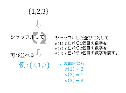 $\sigma(i)$は置換と呼ばれ、ある集合の各元から別の(たまたま同じものになる場合もあるが)元に写す写像を表す。$\sigma$:$i \in I \to i’ \in I$