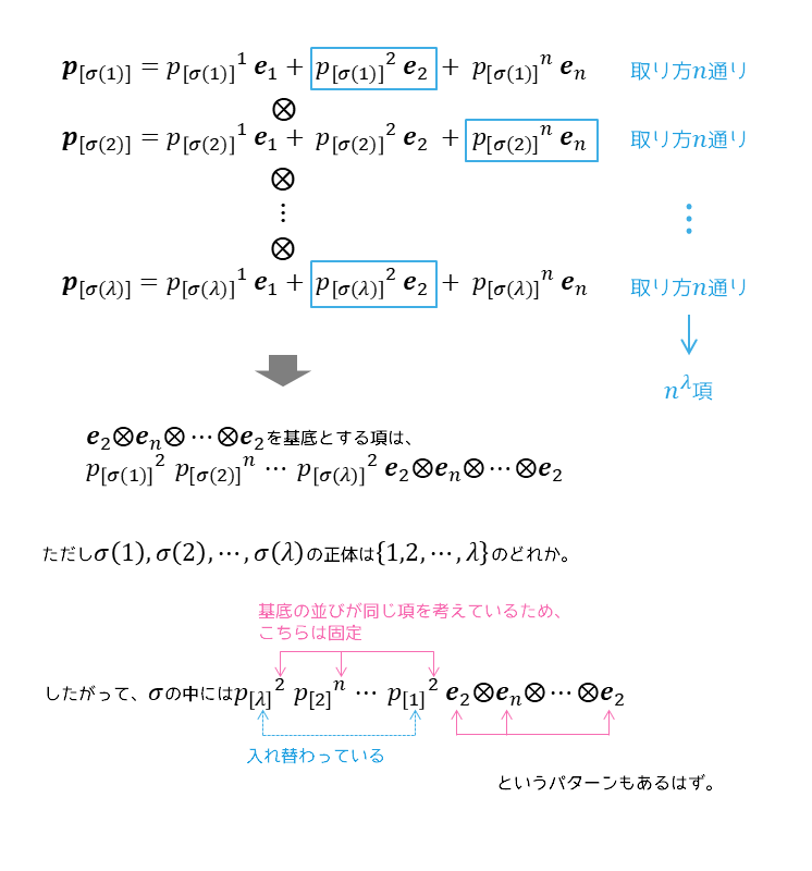 出来る式も異なって来るのだった。$\boldsymbol{p}_1$~$\boldsymbol{p}_\lambda$のテンソル積に違いないのだが、置換$\sigmaでi=1,2,\cdots,\lambda$の順序を入れ替えた$\sigma(i)=\sigma(1),\cdots,\sigma(\lambda)$の順番に従ってテンソル積を取るということである。